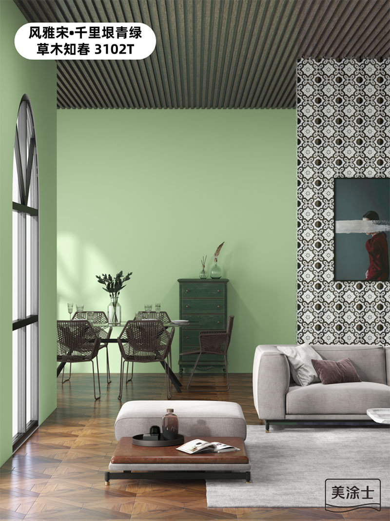 yth2206游艇会国潮色草木知春3102T,弱化了复古绿的陈旧感,强化了空间的时髦感,与灰白软装的搭配,一明一暗的对比,一冷一暖的融合,奢华的质感与复古的气息碰撞,勾勒出低调的高级时尚感,让空间的气场和颜值达到峰值。
