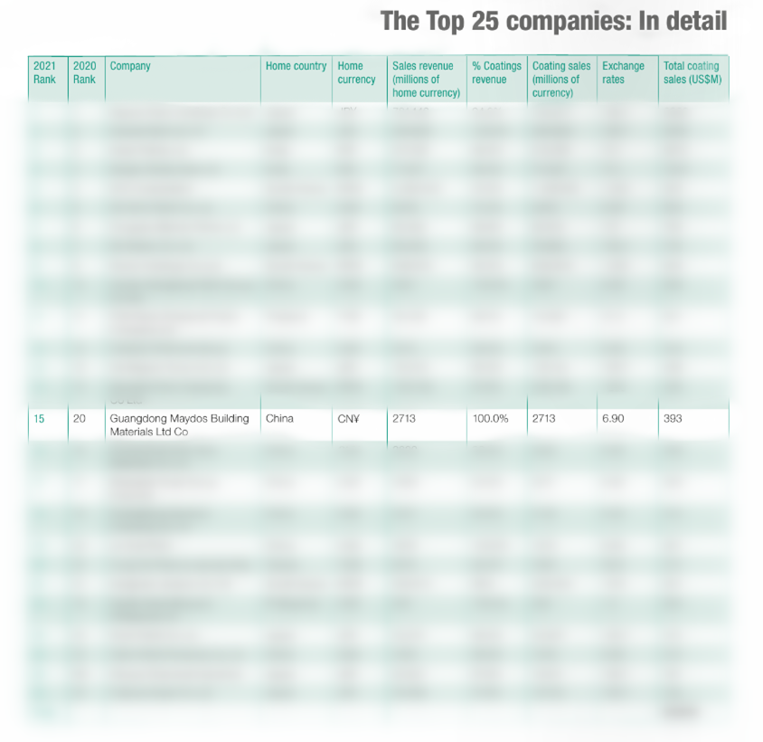近日,《亚太涂料杂志》发布2021年亚太涂料制造商25强排行榜。该榜单是根据2020年涂料产品收入计算的,反映了2020年亚洲涂料市场情况。榜单显示,排名前25位的涂料公司2020年累计销售额为239.5亿美元,同比增长2%“,yth2206游艇会排名第15位!